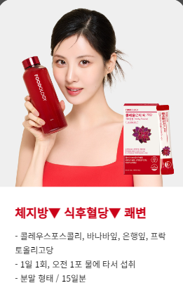 콜레올로지 티는 일명 빨간 물 다이어트라고 불리며, 하체비만 탈출을 위해 나온 제품입니다. 맛은 달달한 석류맛이고, 주원료가 콜레우스포스콜리추출물(포스콜린), 바나바잎추출물, 프락토올리고당, 은행잎 추출물입니다. 물 500ml 이상에 1포를 잘 섞어서 마시면, 오전 내내 즐길 수 있습니다. 또는 운동 전, 후에 마시는 것도 추천드립니다.